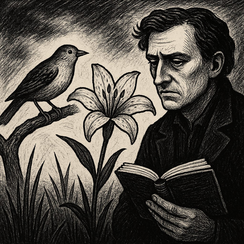 But there’s something strange about the way Egil handles this text. Or rather, what he leaves out. He takes the silent directness of the Lily and the Bird as a good thing, and models his own aspirations on it. But he passes over one of Kierkegaard’s most important complications, the fact that there is another character in his text, along with the lily and the bird: the poet. Yet Egil and Knausgaard make no mention of the poet in their texts, leaving that figure completely out of their discussion of Kierkegaard. And in Kierkegaard’s telling, the poet is a somewhat dangerous and corrosive element: