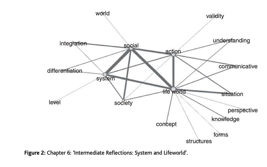 What if we were to make similar maps [DS: network representations of the number of times words appear in the same paragraph], not just for…one chapter, but for the major works of Horkheimer and Adorno, of Habermas, and of Honneth? We first examine each map to make sure that it seems to have validity, in the sense of not suggesting an interpretation that goes against our general understanding of each text. Assuming we find no problems in the individual maps, we then overlay them – and now count up the degree to which, say, the graph of Habermas shares nodes and edges with that of Horkheimer and Adorno, and compare that degree with the degree to which Honneth’s graph shares nodes and edges with the earlier critical theorists. If the number indicating overlap between Habermas and Horkheimer is greater than that for the Honneth–Horkheimer overlap, we would have prima facie evidence of a declining commitment to these core values.