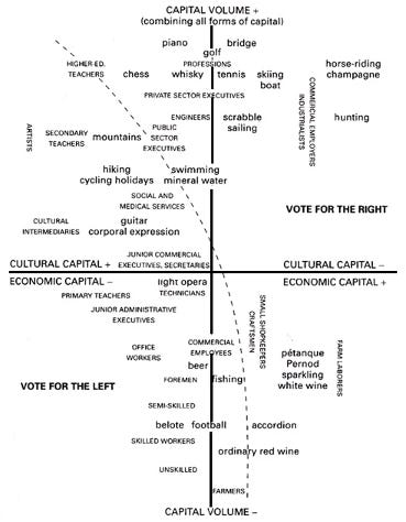 Computer-generated correspondence analyses produced planar maps that highlighted overall structure but had difficulty representing time or small local differences. Even when Bourdieu continued to redraw figures by hand, they increasingly mimicked the style of these computer outputs. His most famous diagram (below) was actually hand drawn, but it is unmistakably influenced by the kinds of statistical outputs his mind had become trained on.